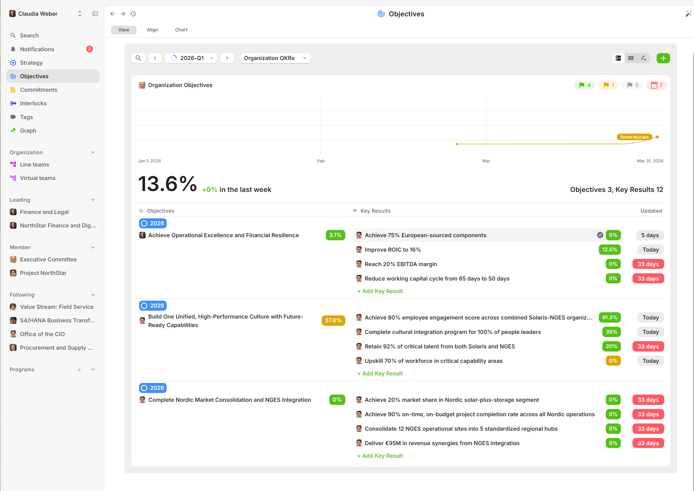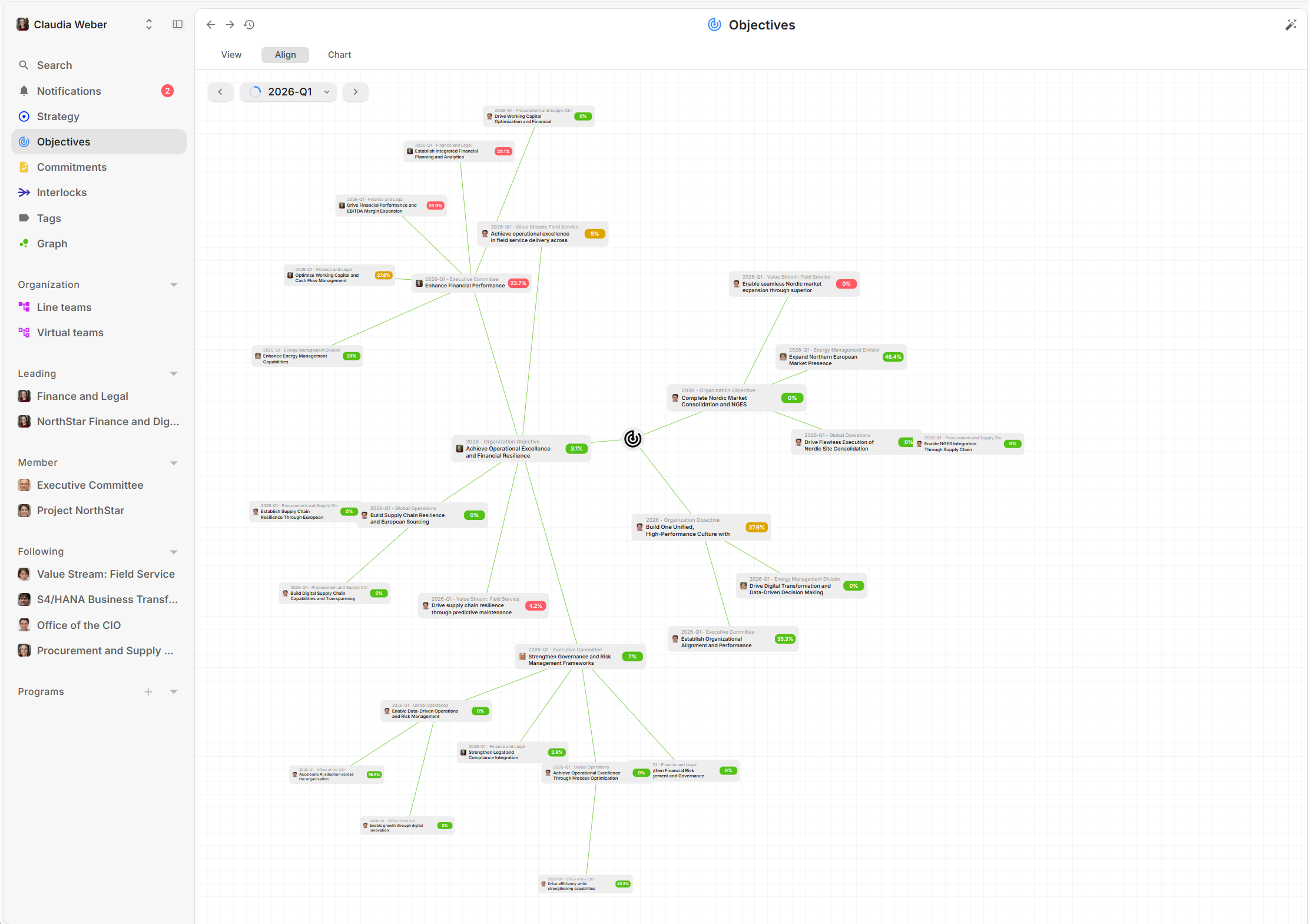 - Short-term OKRs are then aligned to each other and the Organization OKRs. This builds the alignment view for the whole organization.